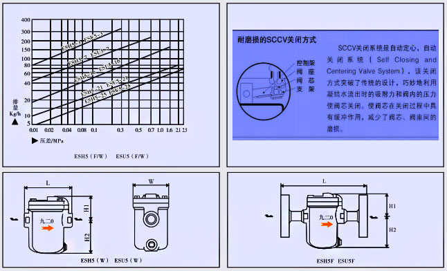 ES鐘型浮子式疏水閥具有SCCV關(guān)閉系統(tǒng),閥芯支架與特殊設(shè)計(jì)而成的“超級(jí)杠桿”相配合。閥芯在閥芯支架內(nèi)是“自由浮動(dòng)的”,避免了關(guān)閉時(shí)產(chǎn)生剛性碰撞。適用于低壓及中低量蒸汽冷凝水流動(dòng)的設(shè)備。吊桶內(nèi)部有水封和提升機(jī)構(gòu),故沒有蒸汽泄漏。吊桶頂部設(shè)有溢出排氣孔,可有效防止蒸汽汽鎖、空氣氣堵現(xiàn)象 (非凝結(jié)性的高溫空氣也可排除)??沙惺芨弑硥海蛇_(dá)90%)。抗水擊。所有內(nèi)件均固定在閥蓋上,易于在線保養(yǎng)維修。ES鐘型浮子式疏水閥/ESH10W鐘型浮子式蒸汽疏水閥/ES8BF倒吊桶式疏水閥/CS15H