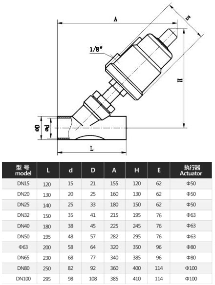 氣動焊接式角座閥工作原理:在非工作狀態(tài)時,由于彈簧力作用,閥門常閉(開)。當(dāng)執(zhí)行器活塞被壓縮氣體作用時,閥門打開(關(guān)閉)。雙作用形式靠壓縮氣體控制閥門開關(guān)。