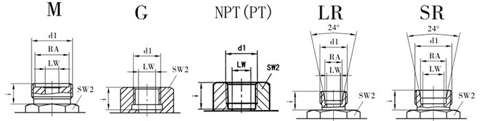 ② 連接代號(hào):M** 、G** 、 **LR 、**SR、PT**、NPT**