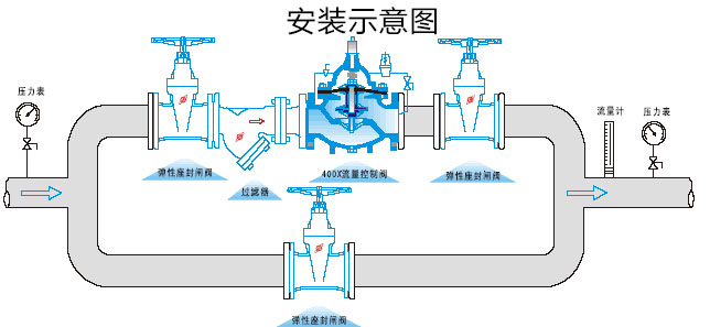 400X流量控制閥由主閥、流量調(diào)節(jié)閥、針閥、導閥、球閥、微形過濾器和壓力表組成水力控制接管系統(tǒng)。利用水力自動操作,控制和調(diào)節(jié)主閥開度,使通過主閥的流量保持不變。