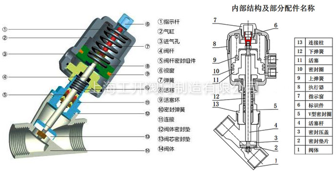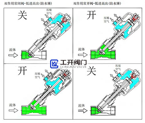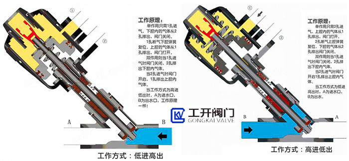 當(dāng)壓縮空氣進(jìn)入氣缸內(nèi)從下向上推動(dòng)活塞運(yùn)動(dòng),使閥門開(kāi)啟;反之壓縮空氣從上向下推動(dòng)活塞運(yùn)動(dòng),使閥門關(guān)閉。