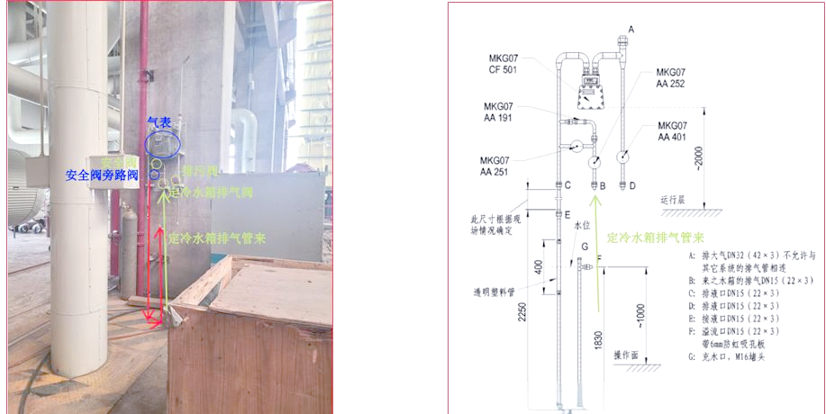 2)接著,開啟水箱排污閥(MKF05AA401)以排放過量的水,持續(xù)至水箱內(nèi)液位在液位計上顯示為高位(700mm)為止。