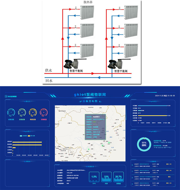 典型應(yīng)用案例:單元入口處回水管道安裝此閥門,即在二次網(wǎng)系統(tǒng)樓前安裝物聯(lián)網(wǎng)水力平衡閥,此平衡閥具有回水溫度采集功能,平衡閥采用RS485通信或內(nèi)置 NB 通訊模塊。通過RS485通信或運營商NB通訊基站將平衡閥所采集的數(shù)據(jù)實時傳輸給云服務(wù)器;用戶可通過PC或手機終端對云端服務(wù)器進行讀取和設(shè)定操作,云端服務(wù)器內(nèi)置全網(wǎng)平衡的軟件策略,云端服務(wù)器會根據(jù)上傳數(shù)據(jù)自動運行平衡策略,實現(xiàn)全網(wǎng)水力平衡,并對閥門開度進行歷史曲線數(shù)據(jù)存儲,最終實現(xiàn)云端服務(wù)器對二次網(wǎng)系統(tǒng)的全網(wǎng)監(jiān)控。