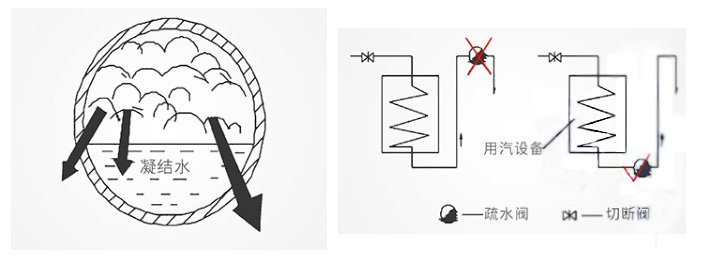 蒸汽疏水閥是排除蒸汽系統(tǒng)內(nèi)產(chǎn)生的凝結(jié)水的一種流體裝置,在安裝配管時,如果不充分了解流體對象一蒸汽和凝結(jié)水的特性,就會導(dǎo)致各種不良后果。我們知道疏水閥內(nèi)的流體是汽水兩相混合物,一般情況下,兩者經(jīng)常處于分離狀態(tài)(參見圖),由于兩者所擁有的熱量和流動速率大不相同,且蒸汽放熱之后會變成凝結(jié)水,使壓力驟然降低。此外,處于高溫高壓下的凝結(jié)水進(jìn)入某一低壓區(qū)時,會發(fā)生急劇的再蒸發(fā)。如果蒸汽疏水閥的配管安裝不當(dāng),在管線內(nèi)兩種不同特性的流體在一起,互相作用,會使原有凝結(jié)水排除發(fā)生困難,有的出現(xiàn)漏汽,有的產(chǎn)生猛烈的水擊。這些故障會使生產(chǎn)效率顯著降低,同時在能源上也是重大損失。