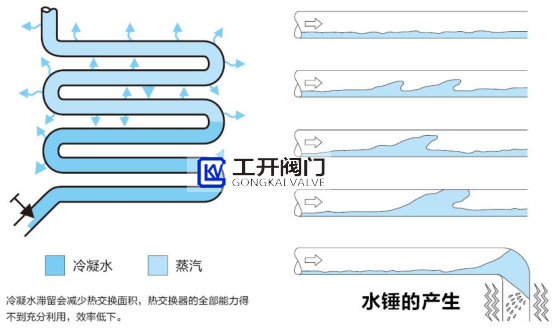 在管道中,冷凝水積聚于管道底部,被高速流動(dòng)的蒸汽推動(dòng)。冷凝水如不及時(shí)排除,在管道底端會(huì)形成波浪,逐漸升高到達(dá)管道頂端,這時(shí)被高速流動(dòng)的蒸汽推動(dòng)行進(jìn)撞擊閥門或管道彎曲配管部分,形成巨大的撞擊聲音。我們把這種現(xiàn)象稱為水錘,水錘不僅會(huì)產(chǎn)生噪音,還會(huì)造成管道接頭彎曲,泄漏,閥門破損等情況。為了防止水錘,冷凝水的排放至關(guān)重要。