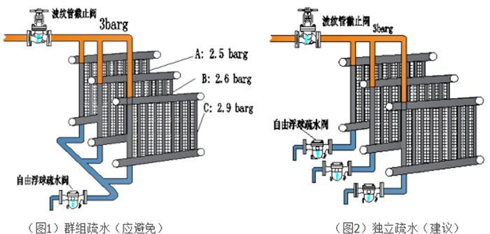 為確保各設(shè)備的高效換熱,應(yīng)避免多臺設(shè)備或一臺設(shè)備的不同加熱段共用一個疏水閥進(jìn)行疏水。每臺設(shè)備都應(yīng)獨(dú)立安裝疏水閥。