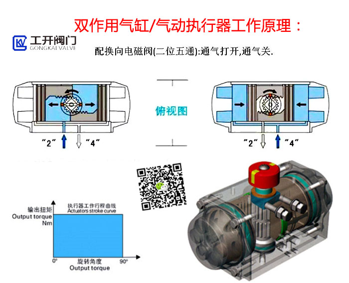 反之氣源壓力從氣口(4)進入氣缸兩端氣腔時,使兩活塞向氣缸中間方向移動,中間氣腔的空氣通過氣口(2)排出,同時使兩活塞齒條同步帶動輸出軸(齒輪)順時針方向旋轉(zhuǎn)。(如果把活塞相對反方向安裝,輸出軸即變?yōu)榉聪蛐D(zhuǎn))