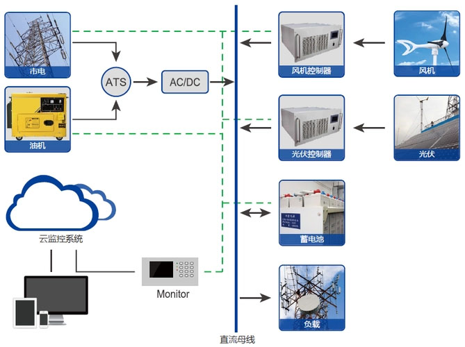 風光互補發(fā)電系統(tǒng)是針對通信基站、微波站、邊防哨所、邊遠牧區(qū)、無電戶地區(qū)及海島,在遠離大電網(wǎng),處于無電狀態(tài)、人煙稀少,用電負荷低且交通不便的情況下,利用本地區(qū)充裕的風能、太陽能建設(shè)的一種經(jīng)濟實用性發(fā)電站。
