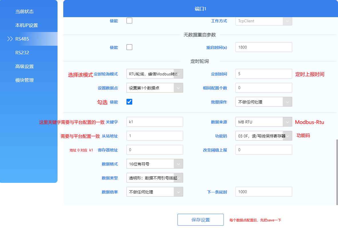 關(guān)鍵字 與寄存器地址:如k1 與寄存器地址0是綁定關(guān)系 、 與云平臺配置采集點模板中 子設(shè)備01中的物模型k1需要一致
